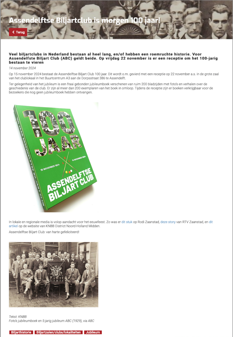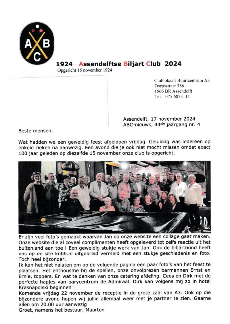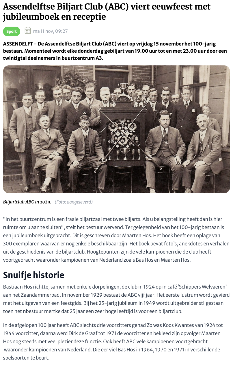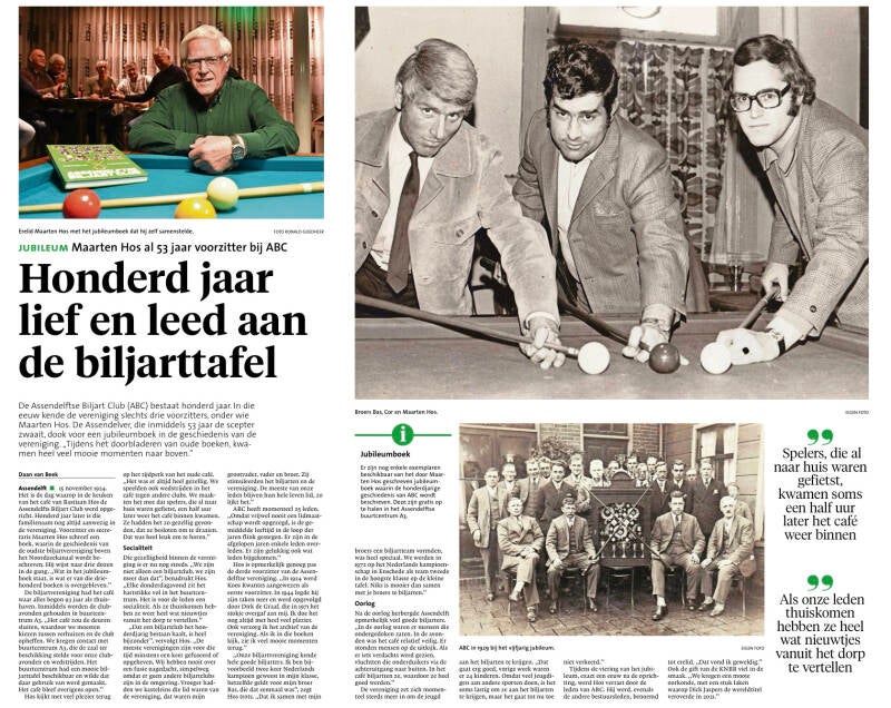 ABC biljartclub in Assendelft sinds 1924